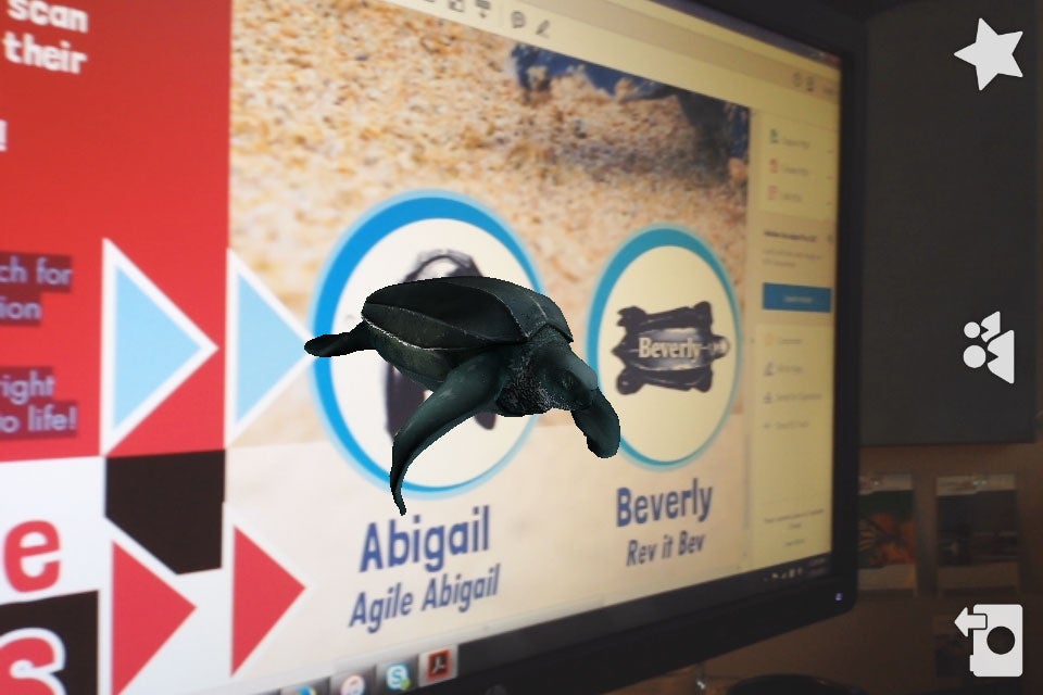 Augmented Reality (AR) blends pre-programed 3D images or animations with live capture video of people or places, then projects the resulting “virtual interaction” on a screen – making it look like you are seeing a leatherback sea turtle there, right in front of you!