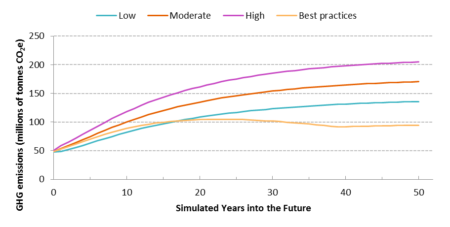 Industrial greenhouse gas (GHG) emissions during simulations of low, moderate, and high development rate, and under moderate development rate with best practices, specifically, 50 per cent reduction in GHG emissions intensity of bitumen sector.