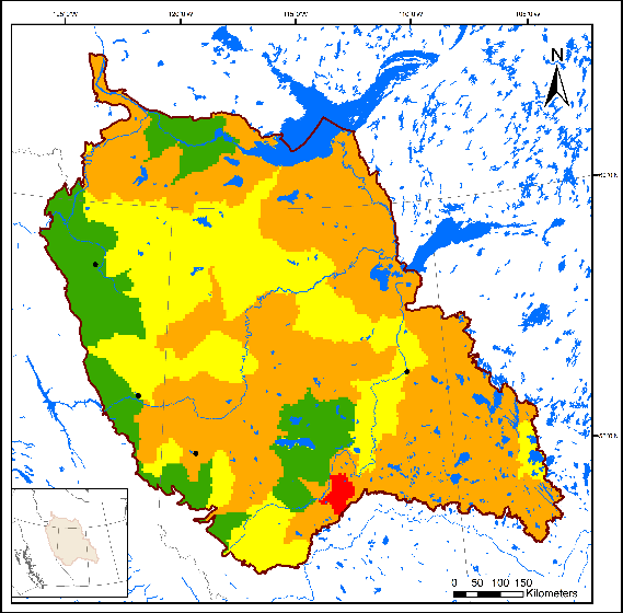 - Forest disturbance from industrial development puts boreal caribou at high risk across most of the region, suggesting population declines and possible loss from large areas. Industry best practices are unlikely to significantly improve the outcome.