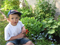 When we bought our house in 2006, there were very few gardens and plants. We removed most of the patio stones and began to amend the soil to plant gardens. Our native plants are all carefully chosen, including trees like cedar, pine, and tamarack; the vine Virginia creeper; ferns; big and little bluestem grasses; switch grass; and many flowering perennials such as liatris, swamp milkweed, wild columbine, goldenrod, bluebells, rudbeckia, and Solomon’s seal. This year we added nodding onion, wild ginger, hyssop, and culver’s root. Next year we plan to make an endangered species/prairie garden with ironweed, cup plant, compass plant, culver’s root, and blue vervain, to name a few. And this year Gabriel started his own garden with coneflower, bee balm, pansies, poppies, and perennial geraniums.