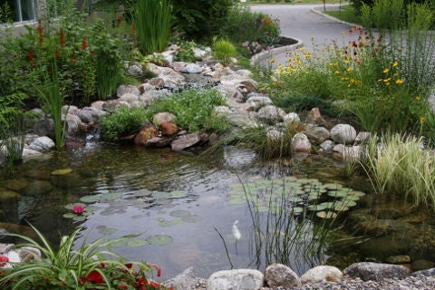 • Try to include a variety of native plants with a good mix of emergent plants, which look great along the edge of your pond; floating plants, which help provide shade; and submerged plants, which provide extra oxygen in your pond.
