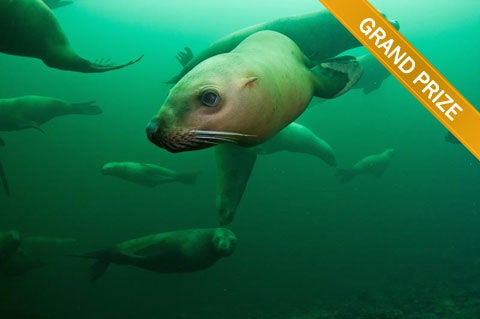 "The sea lions were gathering waiting for the spring herring run. There had to be upwards of one thousand of them spread out through the bay and at times probably one hundred within visual distance underwater. For about three weeks prior to the herrings arrival the sea lions just wanted to play and harass us. Once the herring arrived they totally changed and wanted nothing to do with us, it was time to get down to business I guess."