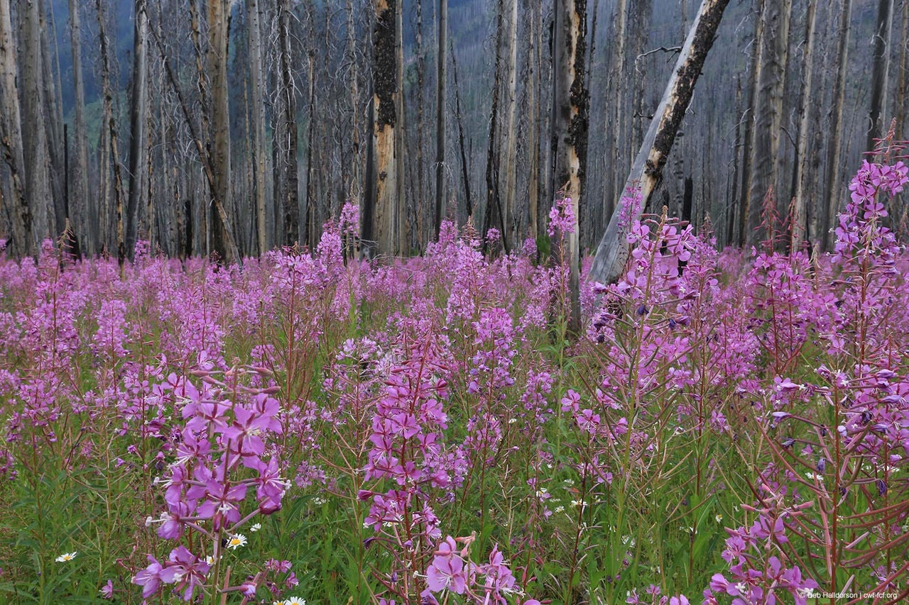 Fireweed can grow from 60 to 180 cm with deep pink flowers blooming along the tops in a spike in mid-summer. As with its name, Fireweed is often the first plant to grow after a fire.