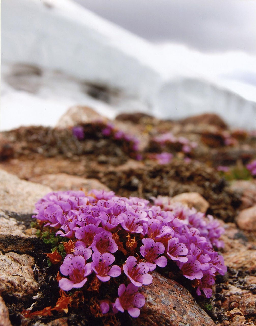 As the name indicates, Purple Saxifrage bears purple flowers although they can also have a magenta hue as well as pale pink. The flowers are one of the first Arctic bloomers, arising above a rounded mat of small green scale-like leaves.