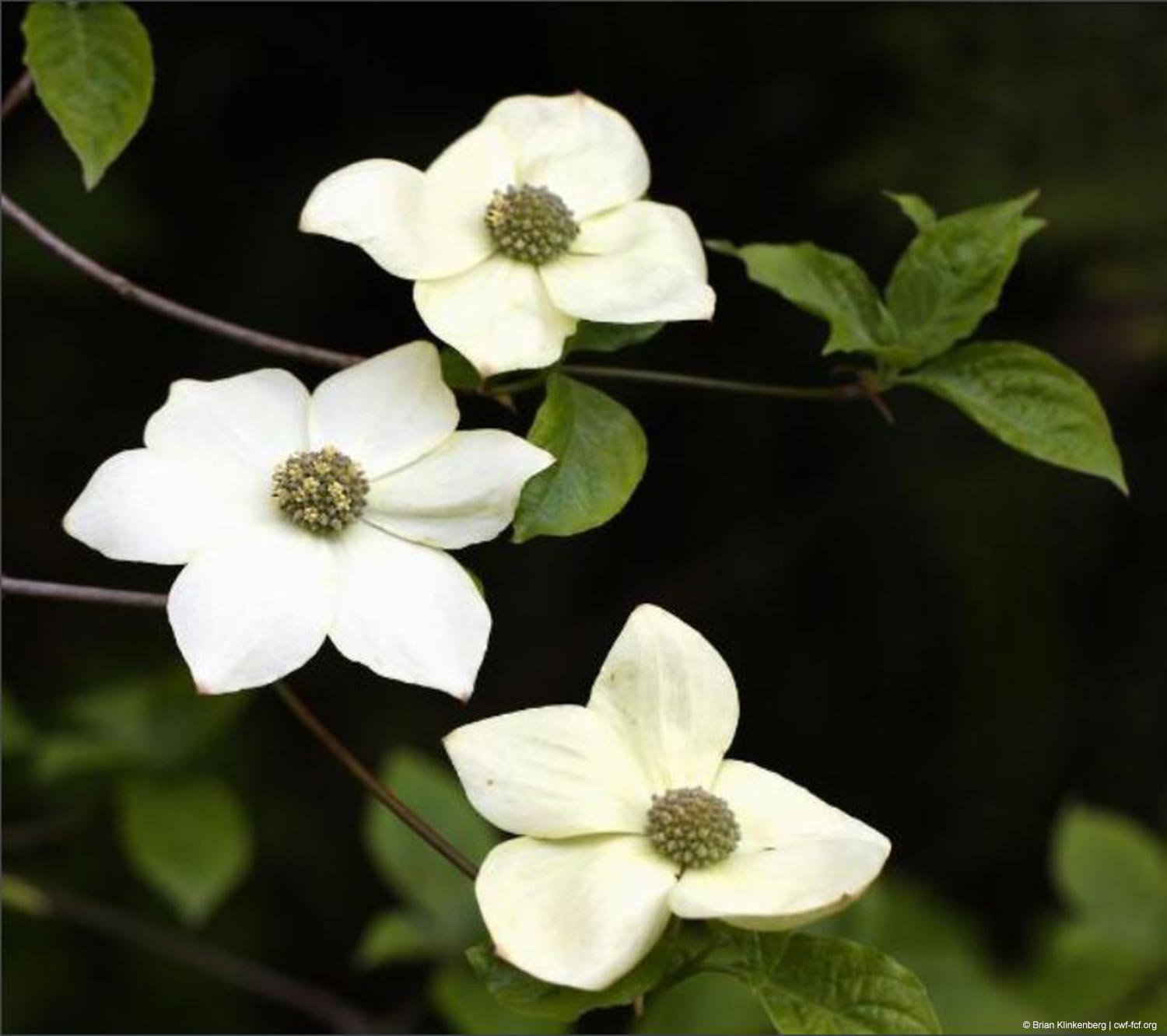 Pacific Dogwood’s cluster of tiny flowers are surrounded by four to seven bracts (modified leaves typically found beneath a flower or flower cluster) that look like large off-white petals. The showy blooms adorn the tree from April to June and stand out in part due to their large size but also as they appear before the leaves open (although they can occasionally bloom a second time later in the season). Insects visit and pollinate the flowers in the spring.