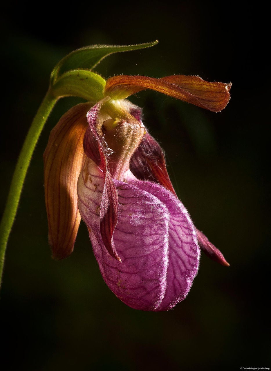 A striking pink flower, blooming from April to July depending on its location in Canada, sits atop a flower stem rising 30 to 50 cm with two upright smooth leaves at its base. Bees pollinate this plant, enticed inside with the hope of nectar within the large pouch and then forced to follow a narrowing path to the back of the flower in order to get out. It is believed to be a clever system of pollination unique to this group. According to William Cullina’s book “Wildflowers”, after doing this enough times bees catch on and visit these plants less during their short lives. The result is that not all flowers are pollinated each year.