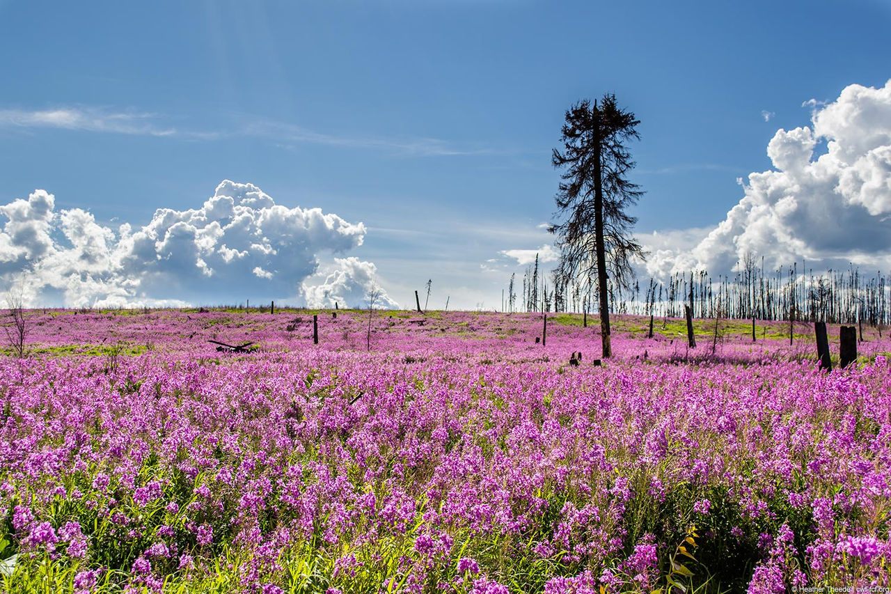 Fireweed became Yukon’s floral emblem in 1957 and was previously classified at Epilobium angustifolium. This hardy plant can grow to form large stands along roadsides, railways, clearings and open dry areas from mid-July to September.