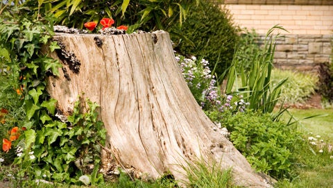 Stumps If you have to cut down a tree and are not able to leave a snag for woodpeckers and other insect-eating or cavity-nesting animals, consider leaving several inches of the stump. It can be an attractive garden accent with flowering plants in a pot on top. Alternatively, grow plants out of the stump by drilling a hole in the centre or wait until the middle starts to naturally decompose. Stumps can also be attractive with plants encircling them. As the stump gradually decomposes, it also will return nutrients to the soil.