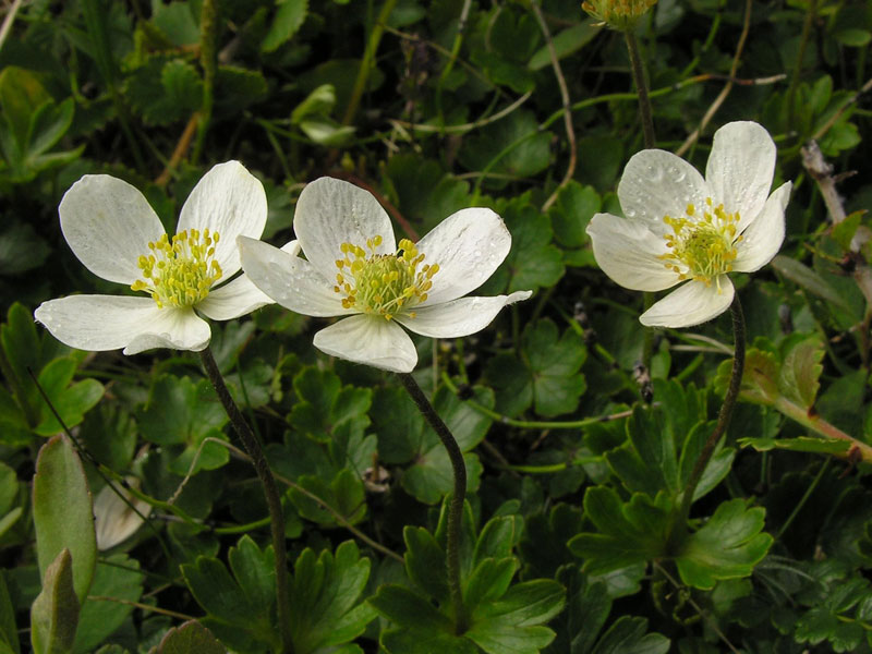 Pyrola asarifolia, Rubus acaulis, Viola palustris, Iris hookeri, Bartsia alpina, Pinguicula vulgaris and Gentianella propinqua. White-flowered alpines include Anemone parviflora, Parnassia palustris, P. glauca, Polygonum viviparum, Cornus suecica, Stellaria longipes, Tofieldia glutinosa and Erigeron hyssopifolius. Yellow-flowered Potentilla neumanniana, P. nivea, Alchemilla minor, Arnica lonchophylla and several dwarf Solidago complete the picture. The cracks among the limestone cliffs are home to several charming ferns: Asplenium viride, Cystopteris fragilis, Woodisa alpina, W. ilvensis, W. glabella and Polystichum lonchitis.