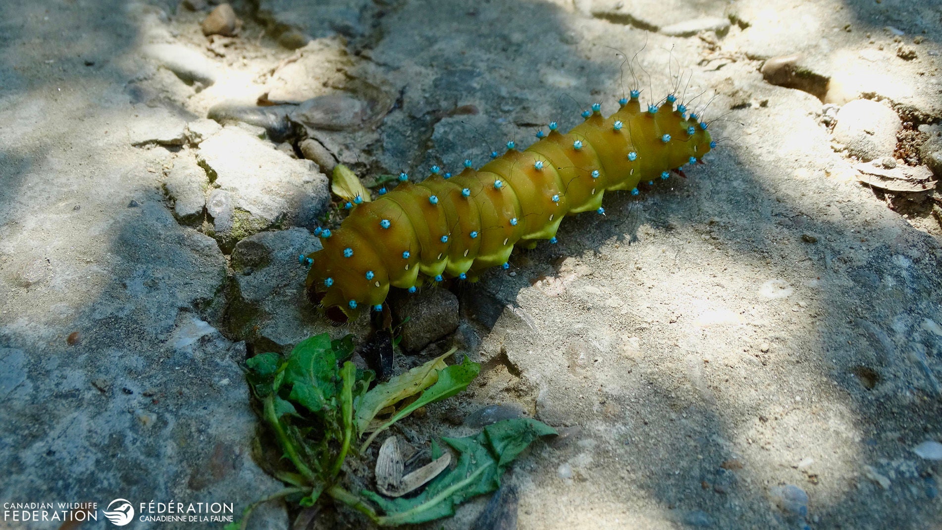 Need we say more? One of the most iconic caterpillar species in Canada. These easy-to-spot caterpillars with their yellow, white and black stripes make it easy to identify and protect. These plump caterpillars can grow up to two inches long with a black antenna at the head.