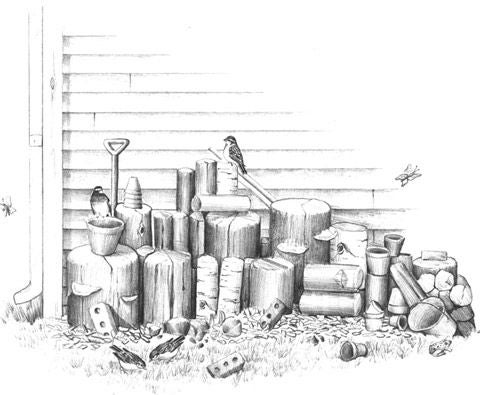 • Place flower pots, bricks, rocks, and lengths of pipe amongst the logs to provide hiding spots and passageways. Leave spaces of different sizes between the various odds and ends.