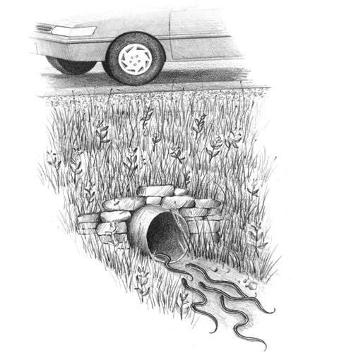 In Manitoba’s Narcisse Wildlife Management Area, wildlife officials discovered that thousands of red-sided garter snakes were being killed on the provincial highway after they left their underground wintering hibernacula. Tunnels have since been placed beneath the road to allow the snakes to travel safely to and from their winter dens.