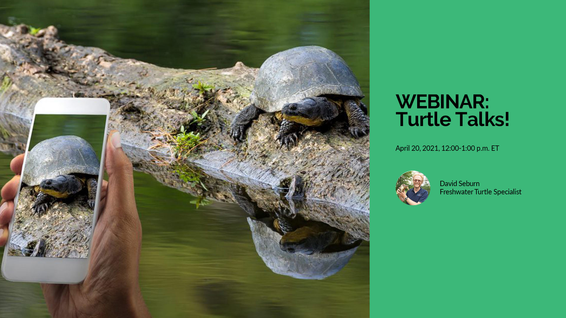 David Seburn is a Turtle Specialist with the Canadian Wildlife Federation (CWF). When it comes to amphibian and reptile conservation, David Seburn is the “turtle” package! Working in this field for more than 20 years, he has written status reports, recovery strategies and more than a dozen scientific papers on amphibians and reptiles, radio-tracked turtles through swamps, and spoken to hundreds of people about turtle conservation. Join David to learn more about Canada’s at-risk freshwater turtle species, discover what CWF is doing to conserve turtles, and learn how you can help our reptilian friends!