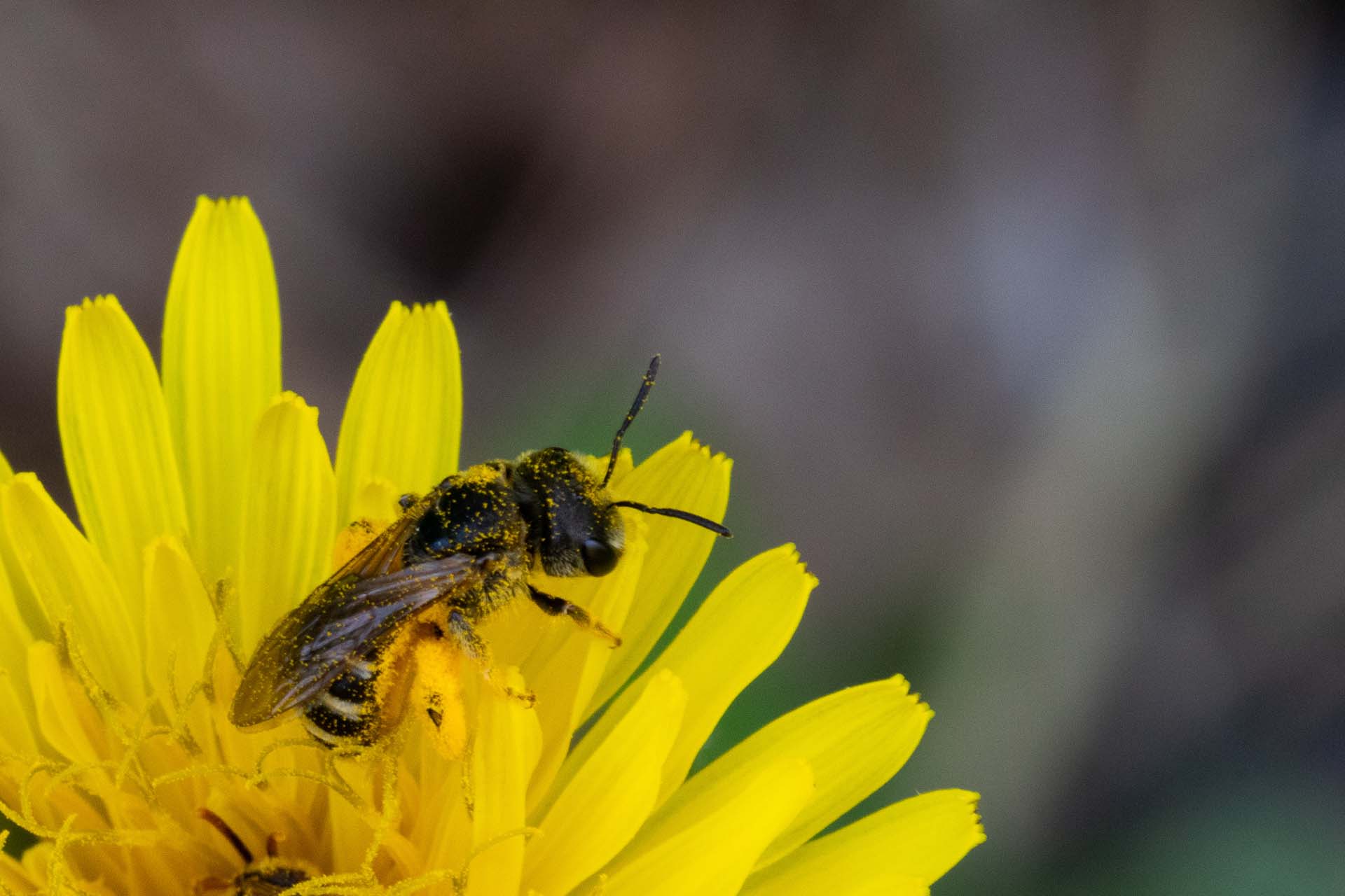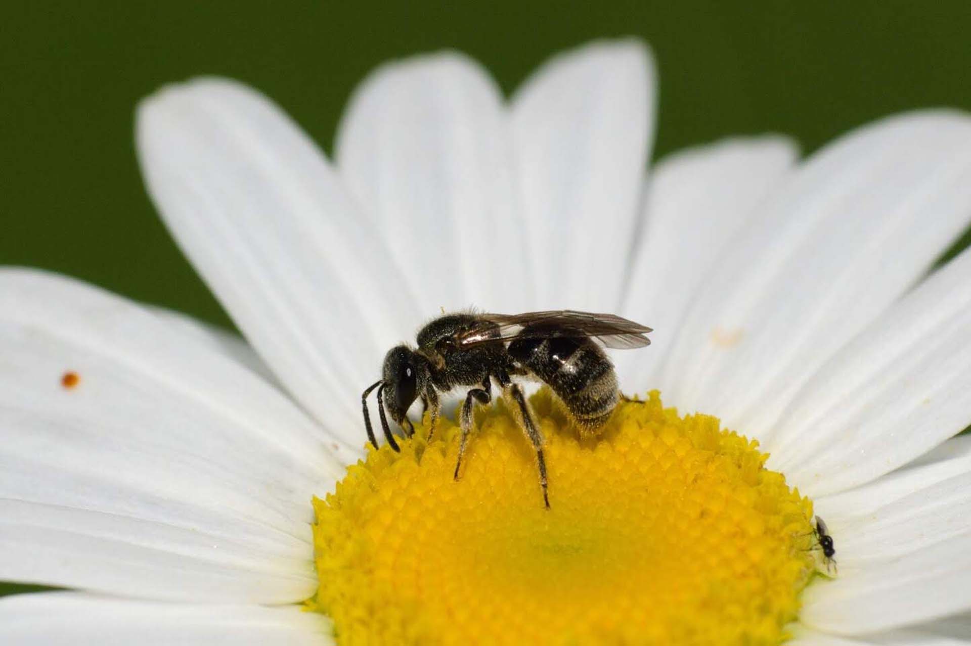 Small sweat bees are usually small, but some are medium-sized (three to 10 mm). Lasioglossum is a very diverse genus with about 100 species in Canada. Usually dark-coloured, they vary in colours from metallic blue to dull green, to brown or black; but some have a light yellow/orange abdomen. These bees are similar to the Halictus bees (above) and they too have males with long antennae.