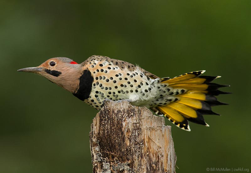 Northern Flickers are a mid-sized woodpecker reaching approximately 32 centimetres. There are two types, the more widely spread Yellow-shafted Northern Flicker and the Red-shafted found mainly in southern British Columbia. Both have a spotted breast, black breast band below the throat, black barring on their backs (lines that run across their backs from wing to wing) and white patch on their rump, visible in flight. The Yellow-shafted males have a red patch at the back of their heads, a black stripe down the side of their brown face and brilliant yellow under their wings and tail. Red-shafted males, however, lack the red patch on the back of their heads, have a red stripe down the side of their grey face and a bright orange-red colour under their wings. They also have a bit of white around the black breast patch. Females of both sub species appear the same except for the lack of the red or black stripe down the side of their face. In areas where both sub species are found close they sometime hybridize making identification tricky.