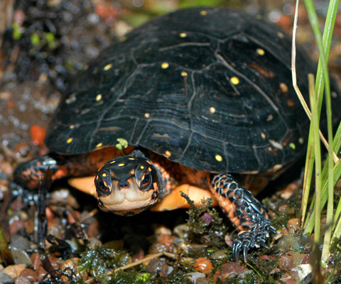 The Spotted Turtle’s upper shell is covered with small yellow or orange spots. Its limbs and tail are black with varying amounts of yellow or orange.