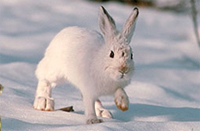 The snowshoe hare one of our commonest forest mammals, is found only in North America. Well-adapted to its environment, the snowshoe hare travels on large, generously furred hind feet, which allow it to move easily over the snow. The snowshoe hare’s ears are smaller than most hares’. The ears contain many veins, which help to regulate body temperature. A seasonal variation in fur colour is another remarkable adaptation: from grey-brown in summer, the fur becomes almost pure white in midwinter.