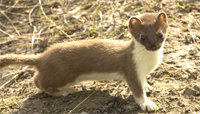 Ermines have features common to the weasel family like a long body, short legs, a long neck and a triangular-shaped head. They are a small weasel; males average 27 cm and females measure up at 24 cm with their tail adding another 7.5 cm to their length. Males are larger than females and weigh on average 80 g while females weigh an average of 54 g. Ermines change the colour of their coats seasonally. In the summer, their backs are brown, their undersides are white and their tails sport a black tip. In the winter, they are completely white except for their black tipped tail.
