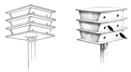 • Improperly designed martin houses are a serious problem — if rooms are too small, nestlings may die of overheating in the summer. Visit www.hww.ca to learn how to build a proper purple martin house.