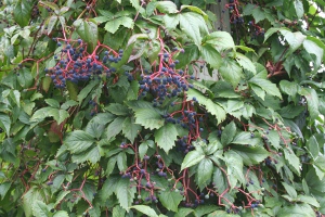This vine has a woody stem and leaves composed of five leaflets, arranged palmately — like fingers that spread out from the palm of your hand. Its white flowers bloom by the end of the summer producing dark yet bright blue fruit in the early fall. This is in striking contrast to the brilliant red of its fall leaves.