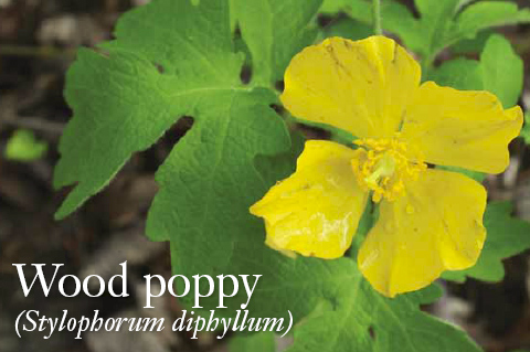 The wood poppy stands up to 40 centimetres tall. The leaves are mainly basal and up to 15 cm long and 6 cm across with a paler underneath with five to seven deeply divided, irregular lobed or toothed segments. The flower is deep yellow with four petals each 2 to 5 cm long; occur in clusters of up to four, blooming in May and early June. The fruit is a greyish hairy seed pod capsule divided into three or four longitudinal segments. All parts have a bitter yellow sap.