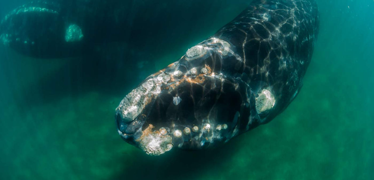 The North Atlantic right whale (Eubalaena glacialis) has a large head that takes up nearly a quarter of the length of its body. Right whales, which can grow up to 18 metres in length can be recognized by: