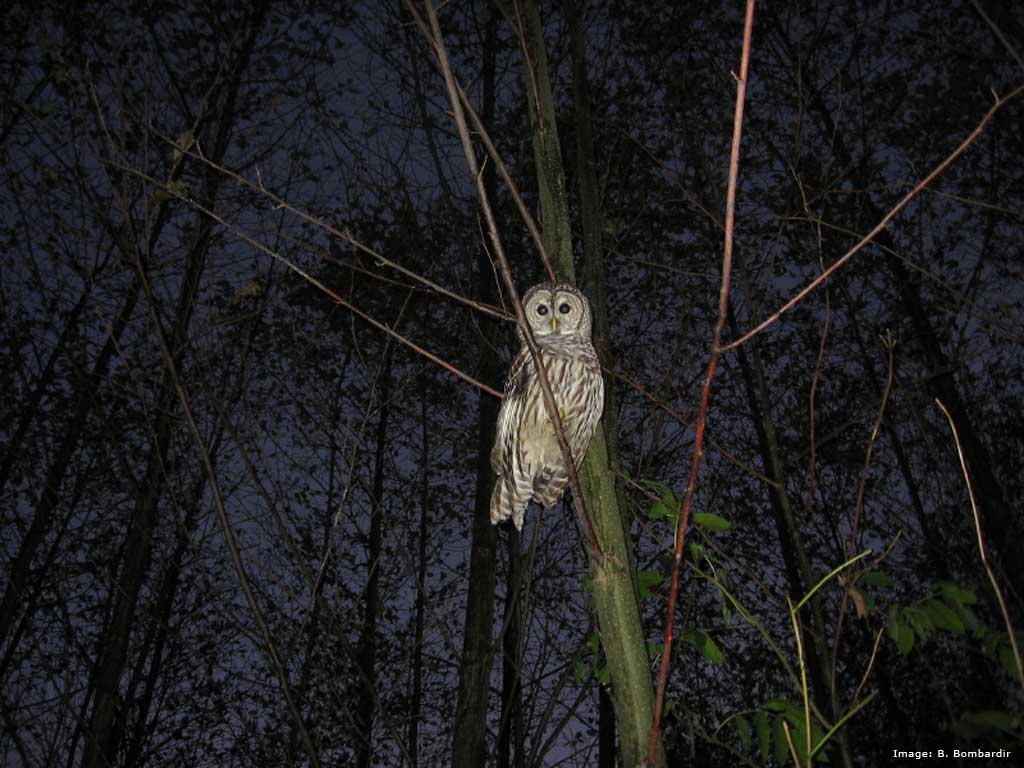 Download this wild wallpaper! A resident of deep forests, including swamps, riparian and upland habitats, the barred owl often relies on secondary tree cavities for nests. Because it is associated with large trees in old forests, this raptor is often used as an indicator species in the management of old forests.