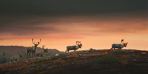 Le 8 octobre au matin, continuant de parcourir la région et de la découvrir, je pris la direction nord-est afin de rechercher une voie de portage possible vers la Kogaluk que Stephen Loring avait suggérée. En chemin, j’avais l’intention d’aller en reconnaissance le long de la rivière Kamestastin afin de rechercher des pistes de caribou indiquant qu’ils traversaient à l’est du lac. John Pitcher, l’un de nos artistes, s’était joint à moi à la dernière minute. Nous sommes donc partis pour notre première journée de beau temps, malgré la température froide et un fort vent du nord. Quelques kilomètres plus loin, alors que nous faisions une courte pause pour observer les environs à la jumelle et repérer notre route, j’ai remarqué une partie de ce qui s’est avéré être une importante harde de caribous, à environ 800 mètres à l’est de l’endroit où nous nous trouvions. Nous nous sommes dirigés vers eux. Le premier groupe a évité une rencontre suffisamment proche pour nous permettre de bonnes photos, mais à notre plus grande joie, d’autres groupes suivaient. Au cours de la journée, nous avons vu plus de 500 caribous, la plupart à distance rapprochée, avec des mâles splendides, et tous dans la meilleure condition. À notre retour au camp, il s’est avéré que tous les membres de l’équipe avaient fait des rencontres similaires durant la journée; les caribous étaient donc bien arrivés.