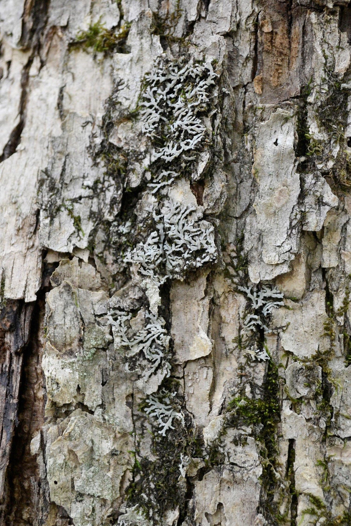 Pleins d'espoir, ils se sont aventurés hors des sentiers battus vers de grands peuplements d'arbres à feuilles caduques contenant de nombreux d'ostryers de Virginie, l'arbre hôte préféré de la physconie pâle. Ils ont fouillé des dizaines d'arbres - armés de loupes simples et d'un œil aiguisé ne laissant échapper aucun détail. Les membres de l'équipe ont disparu et réapparu parfois pendant l'espace de 20 minutes, demeurant toujours à portée d'oreille. La matinée et l'essentiel de l'après-midi n'ayant abouti à rien, Troy McMullin a finalement interpellé le groupe, et tout le monde s'est précipité vers lui. Il pointait une petite surface de lichen, pas plus grande que le pouce. C'était le lichen que nous recherchions tous! On s'est tapé dans les mains et les flashs des appareils-photo se sont mis à crépiter.