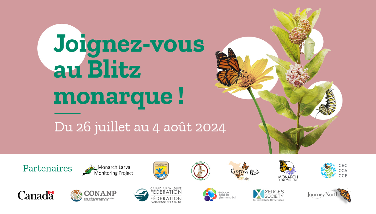 Le Blitz international de suivi du monarque est de retour pour sa huitième édition du 26 juillet au 4 août 2024 ! Le Blitz offre une occasion unique aux personnes et aux organisations au Canada, aux États-Unis et au Mexique de faire équipe au-delà des frontières internationales pour protéger cette espèce emblématique d’Amérique du Nord.