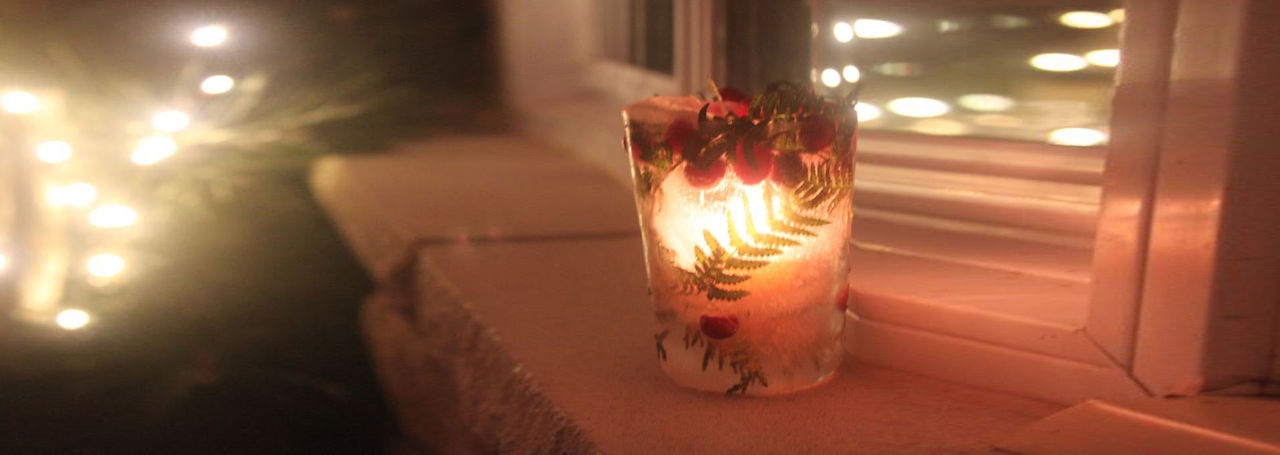 Ajoutez à l’eau toutes les baies, feuilles ou autres décorations qui vous plaisent, comme des tranches d’orange ou des petits cônes, et disposez-les comme vous le souhaitez tout autour de la lanterne. Pour ma part, j’utilise surtout du vert et du rouge pour une allure aux couleurs brillantes et seulement quelques cônes, ou même parfois aucun.