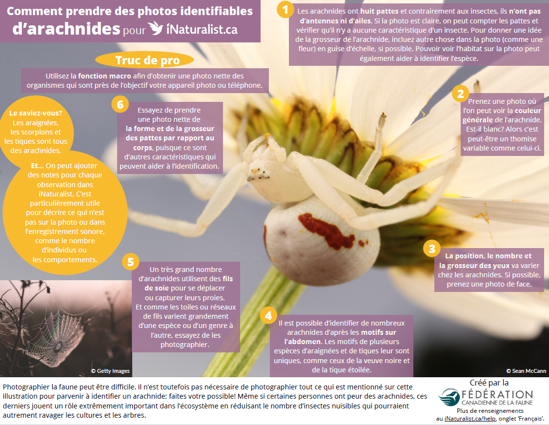 Photographier la faune peut être difficile. Il n’est toutefois pas nécessaire de photographier tout ce qui est mentionné sur cette illustration pour parvenir à identifier un arachnide; faites votre possible! Même si certaines personnes ont peur des arachnides, ces derniers jouent un rôle extrêmement important dans l’écosystème en réduisant le nombre d’insectes nuisibles qui pourraient autrement ravager les cultures et les arbres.