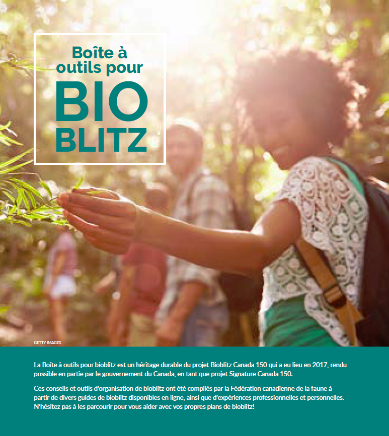 La Boîte à outils pour bioblitz est un héritage durable du projet Bioblitz Canada 150 qui a eu lieu en 2017, rendu possible en partie par le gouvernement du Canada, en tant que projet Signature Canada 150. Ces conseils et outils d’organisation de bioblitz ont été compilés par la Fédération canadienne de la faune à partir de divers guides de bioblitz disponibles en ligne, ainsi que d’expériences professionnelles et personnelles. N’hésitez pas à les parcourir pour vous aider avec vos propres plans de bioblitz!