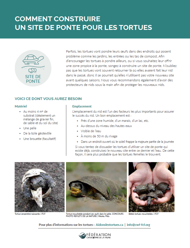 Parfois, les tortues vont pondre leurs oeufs dans des endroits qui posent problème comme les jardins, les entrées ou les tas de compost. Afin d’encourager les tortues à pondre ailleurs, ou si vous souhaitez leur offrir une zone propice à la ponte, songez à construire un site de ponte. N’oubliez pas que les tortues vont souvent retourner là où elles avaient fait leur nid dans le passé, donc il se pourrait qu’elles n’utilisent pas votre nouveau site avant quelques saisons. Nous vous recommandons également d’avoir des protecteurs de nids sous la main afin de protéger les nouveaux nids.