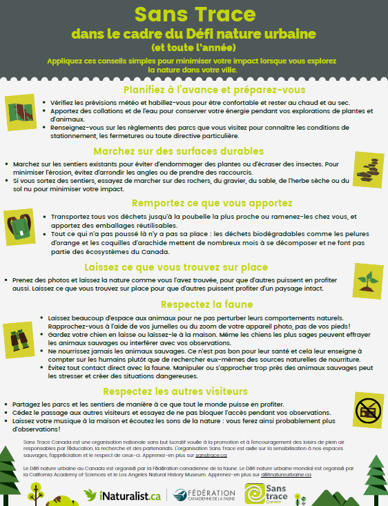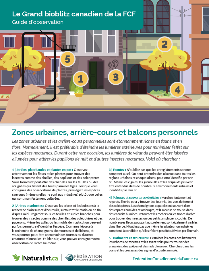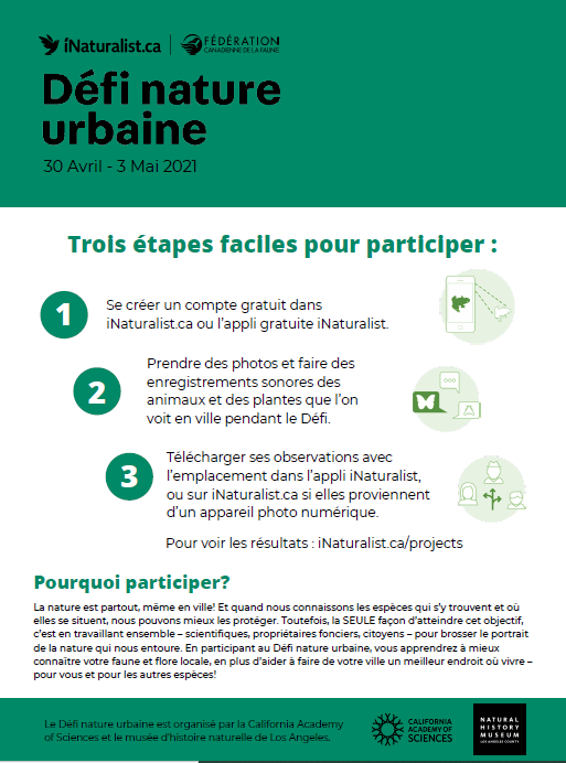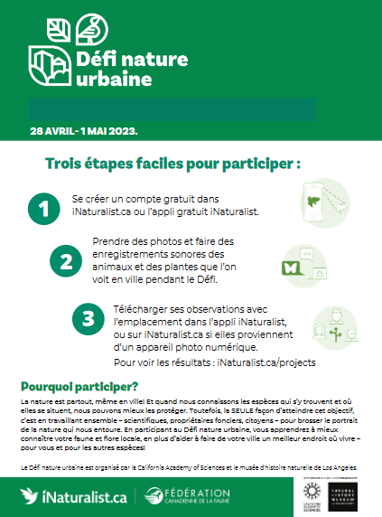 La nature est partout, même en ville! Et quand nous connaissons les espèces qui s’y trouvent et oùelles se situent, nous pouvons mieux les protéger. Toutefois, la SEULE façon d’atteindre cet objectif,c’est en travaillant ensemble – scientifiques, propriétaires fonciers, citoyens – pour brosser le portraitde la nature qui nous entoure. En participant au Défi nature urbaine, vous apprendrez à mieuxconnaître votre faune et flore locale, en plus d’aider à faire de votre ville un meilleur endroit où vivre –pour vous et pour les autres espèces!